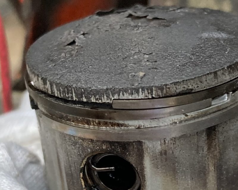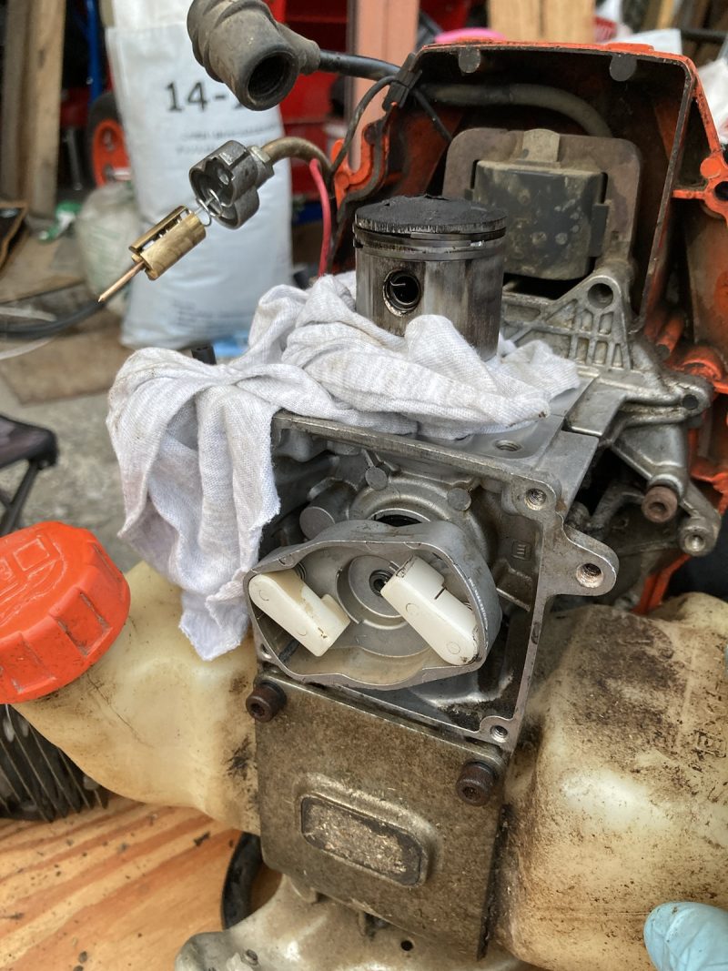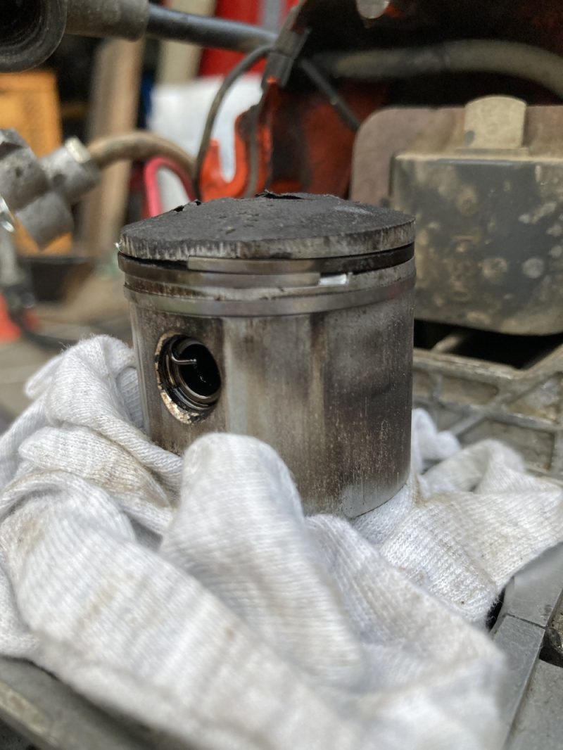 少し前に通常作業をした後何日か経ってから指導しようとしたらかからなくなったマシンです。トラブルシューティングの結果原因はピストンリングが折れたことによる圧縮漏れでした。ピストン、リング、シリンダーなどを一式交換した作業を紹介します。交換部品だけで18600円もかかってしまい修理を実施するか戸惑いました。